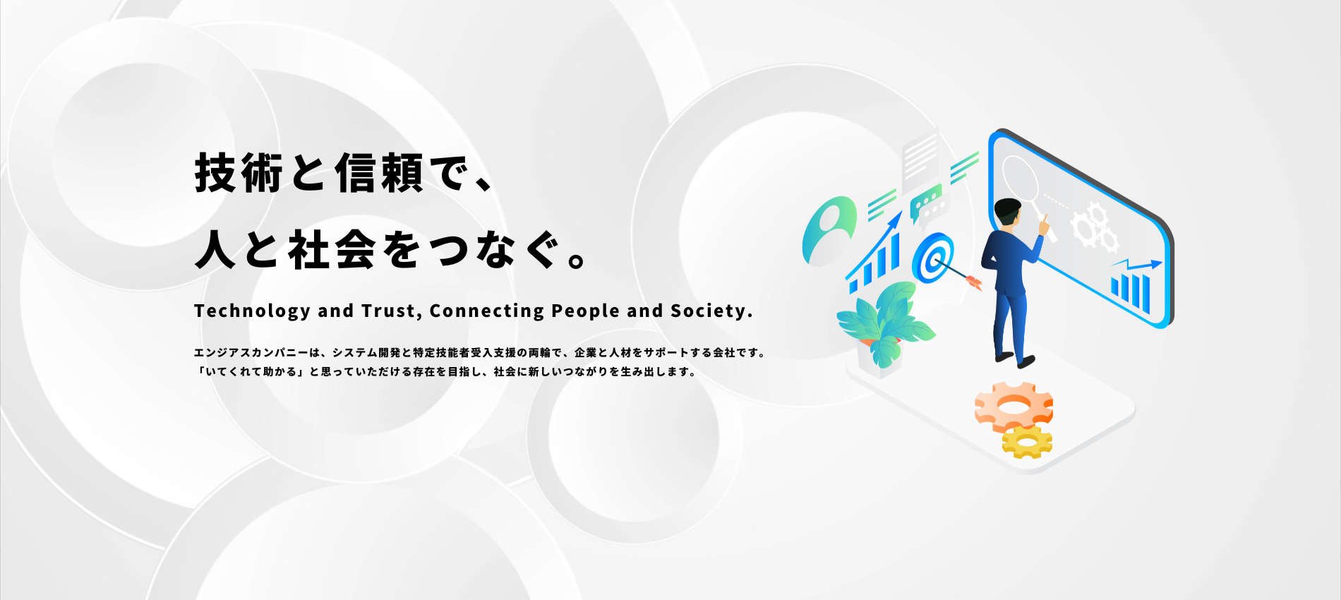 私たちの社名「エンジアス」は、Engineer(技術者)・Asia(アジア)・Us(私たち)を組み合わせた造語です。多様な文化や価値観を尊重し、アジアと日本をつなぐ懸け橋となることを目指しています。