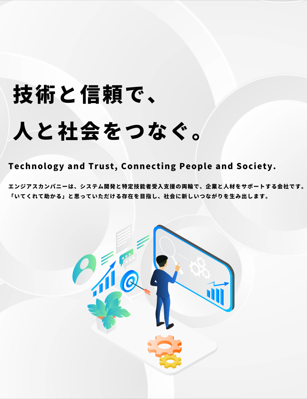 私たちの社名「エンジアス」は、Engineer(技術者)・Asia(アジア)・Us(私たち)を組み合わせた造語です。多様な文化や価値観を尊重し、アジアと日本をつなぐ懸け橋となることを目指しています。